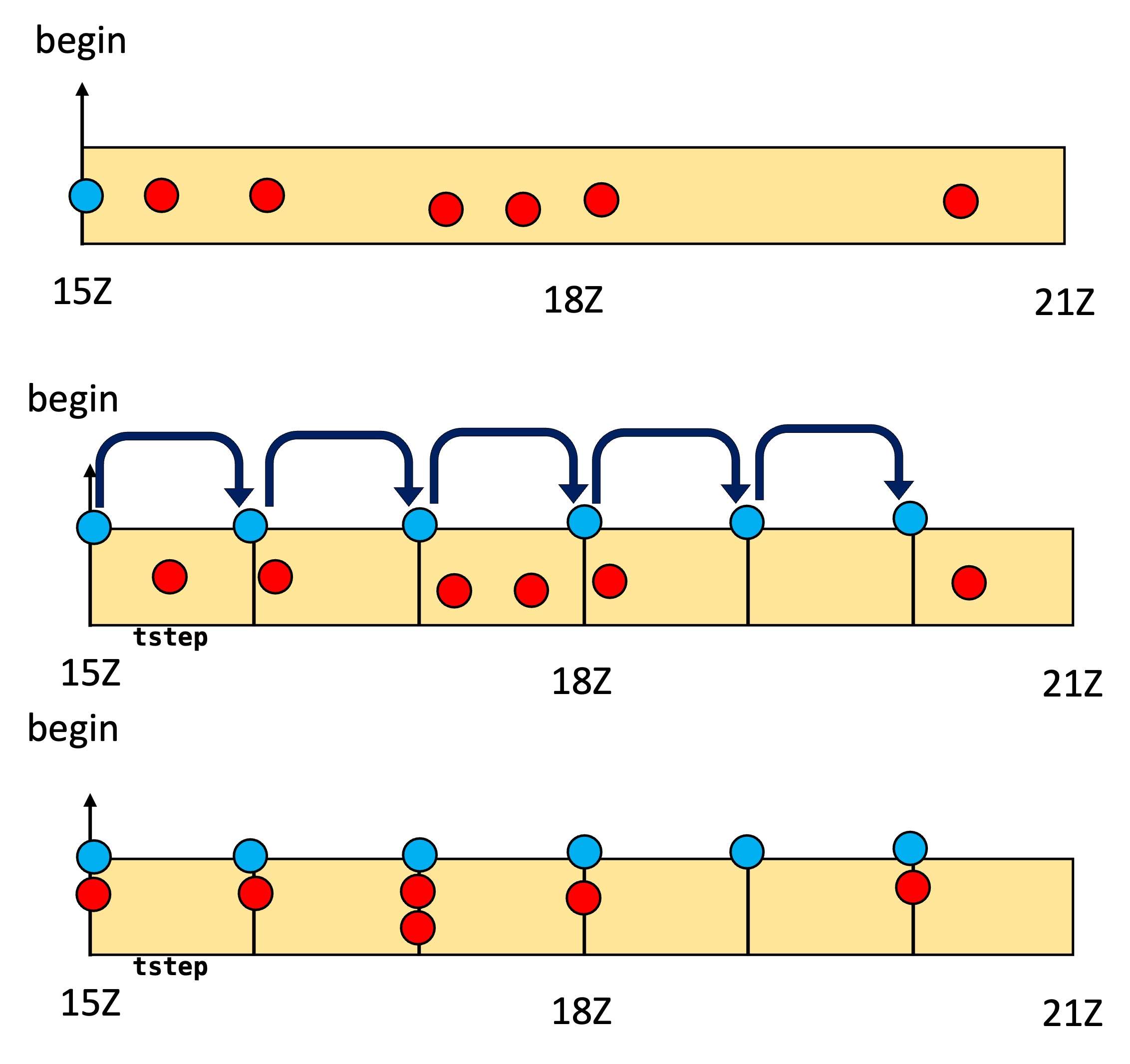 In HofX4D we want to compute H(x) at appropriate observation time. For this a model needs to be included into the procedure and at each model time step (step in the figure below) the observaiton operator is applied for the observations that fall into the current time.